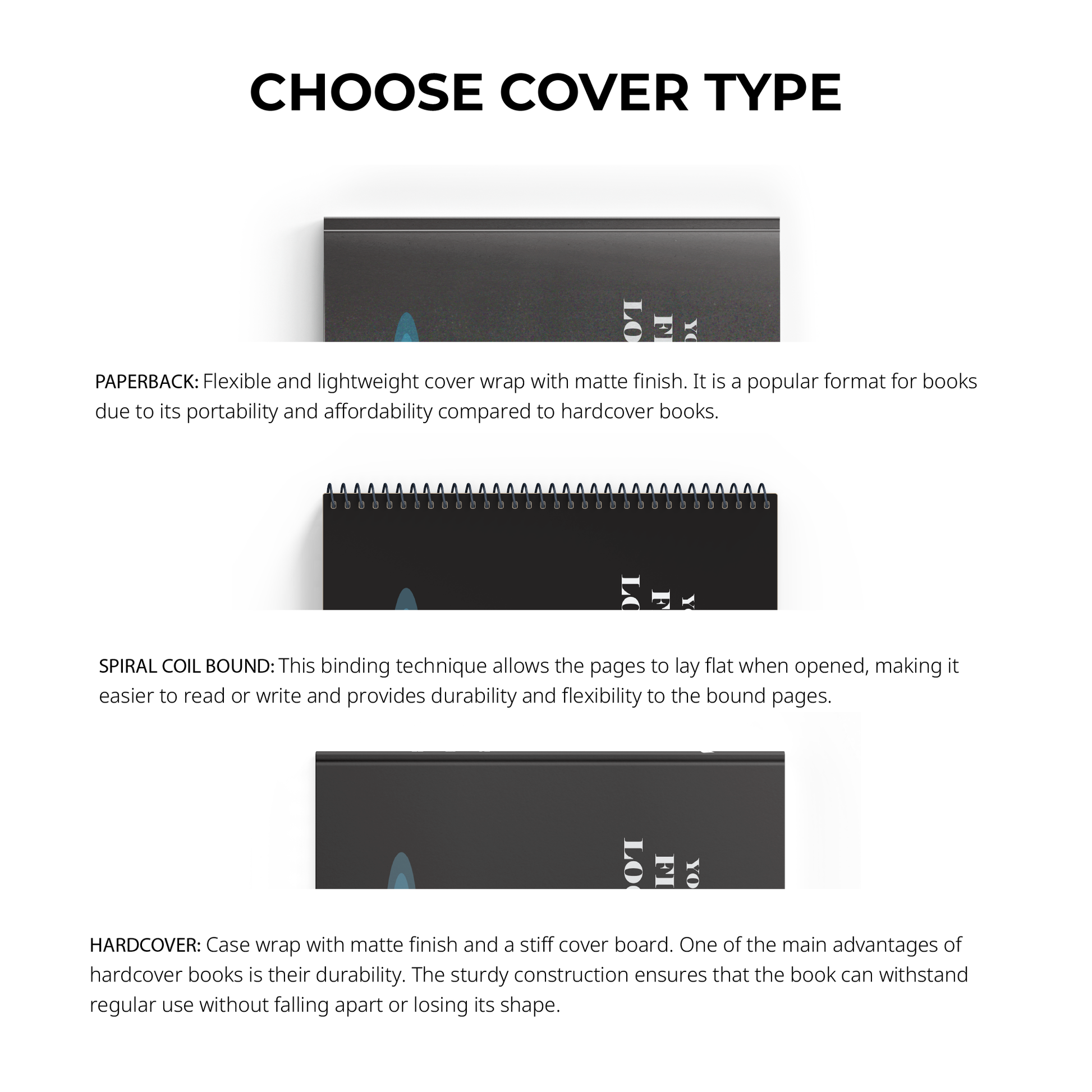 📗 Cover page types: Hardcover, Paperback, Coil bound.